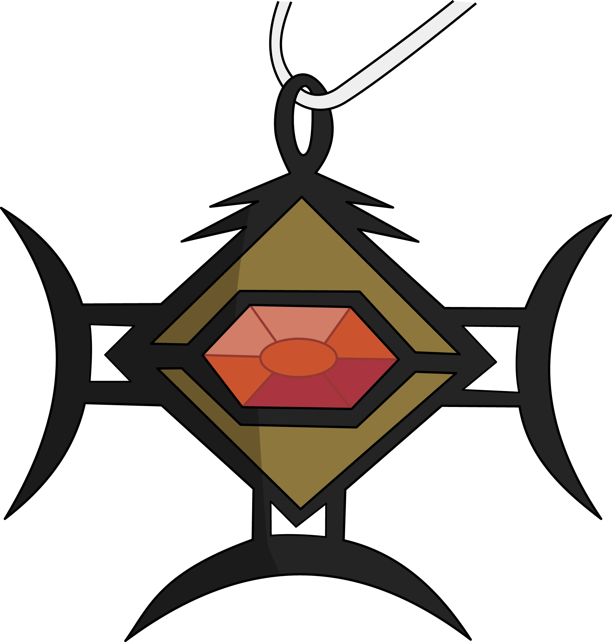 The Eye of Dashi is a pendant with a red ruby in the center. The rhombus-shape of the pendant surrounding the ruby is a light brown color. The sides and the hole of the Eye of Dashi are black. On an occasion, the Eye is seen with a string to be worn on a necklace.